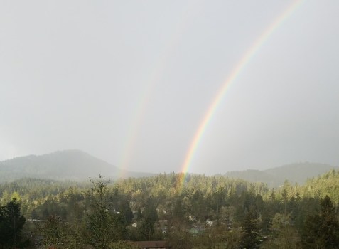 Previous Image Next Image Double Rainbow Double rainbow this morning! In between the sunshine, pouring rain, howling winds, flying tree branches, we also had glimpses of double rainbows.